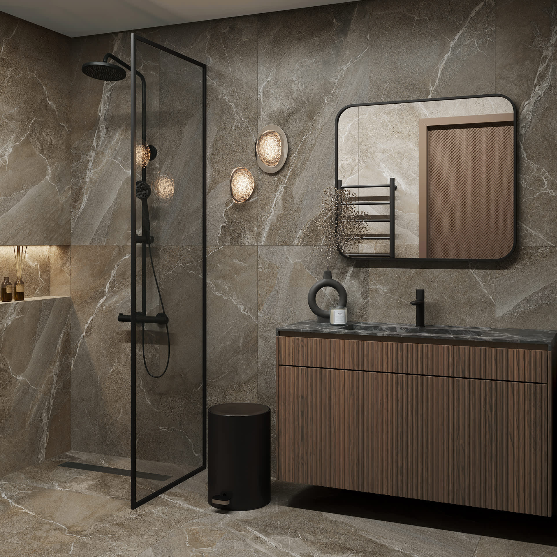 - Черные матовые металлы служат графичными акцентами.